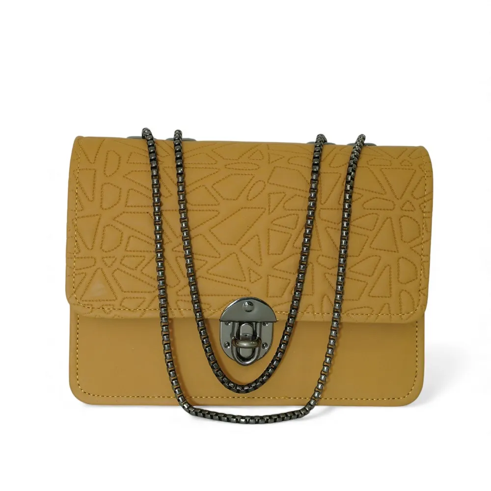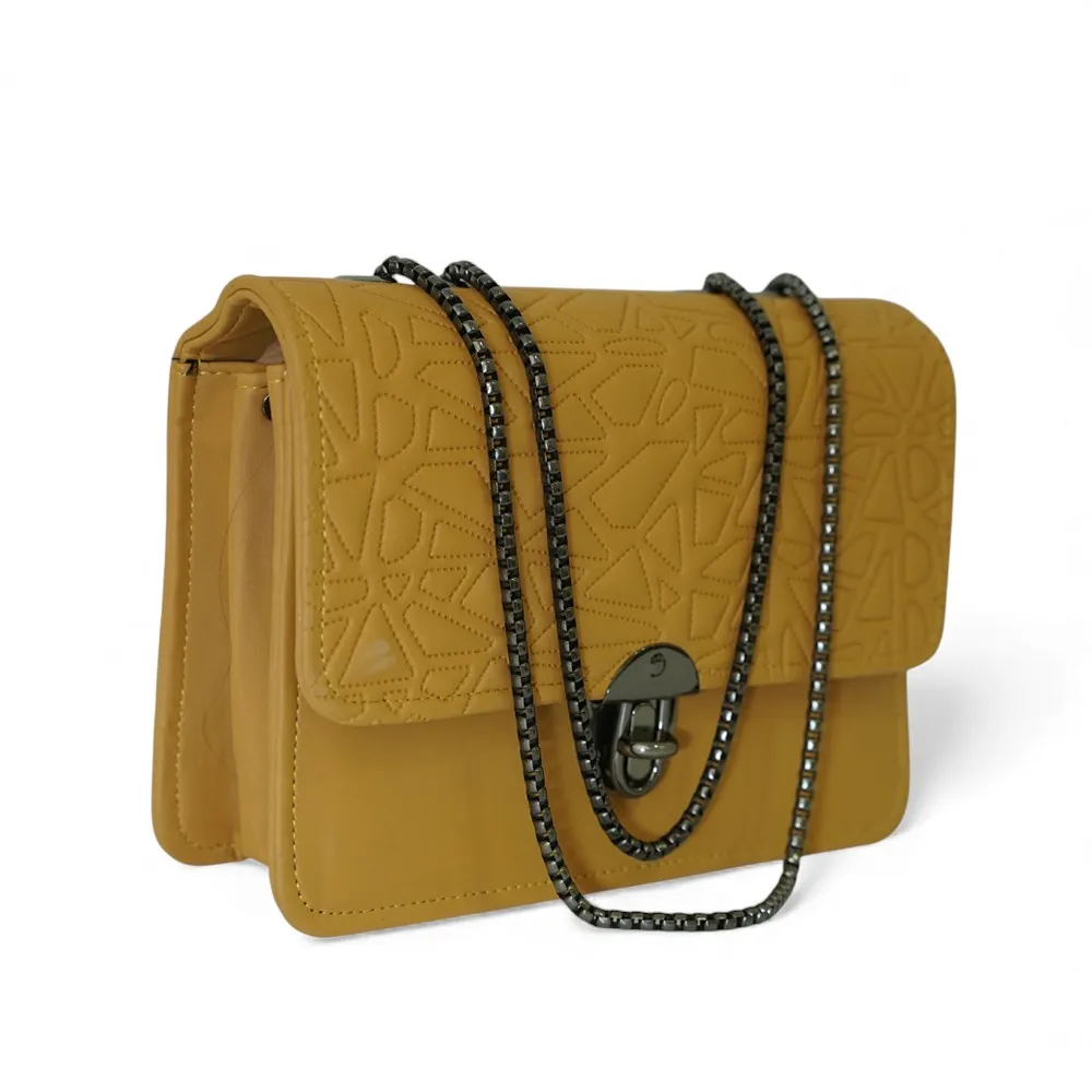 It comes with a metallic box chain strap, allowing it to be worn as either a shoulder bag or crossbody. The overall design is modern yet elegant, suitable for both casual and semi-formal occasions.