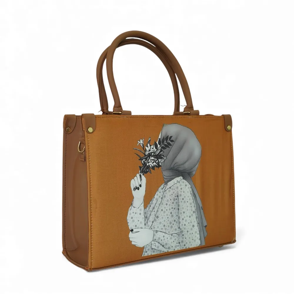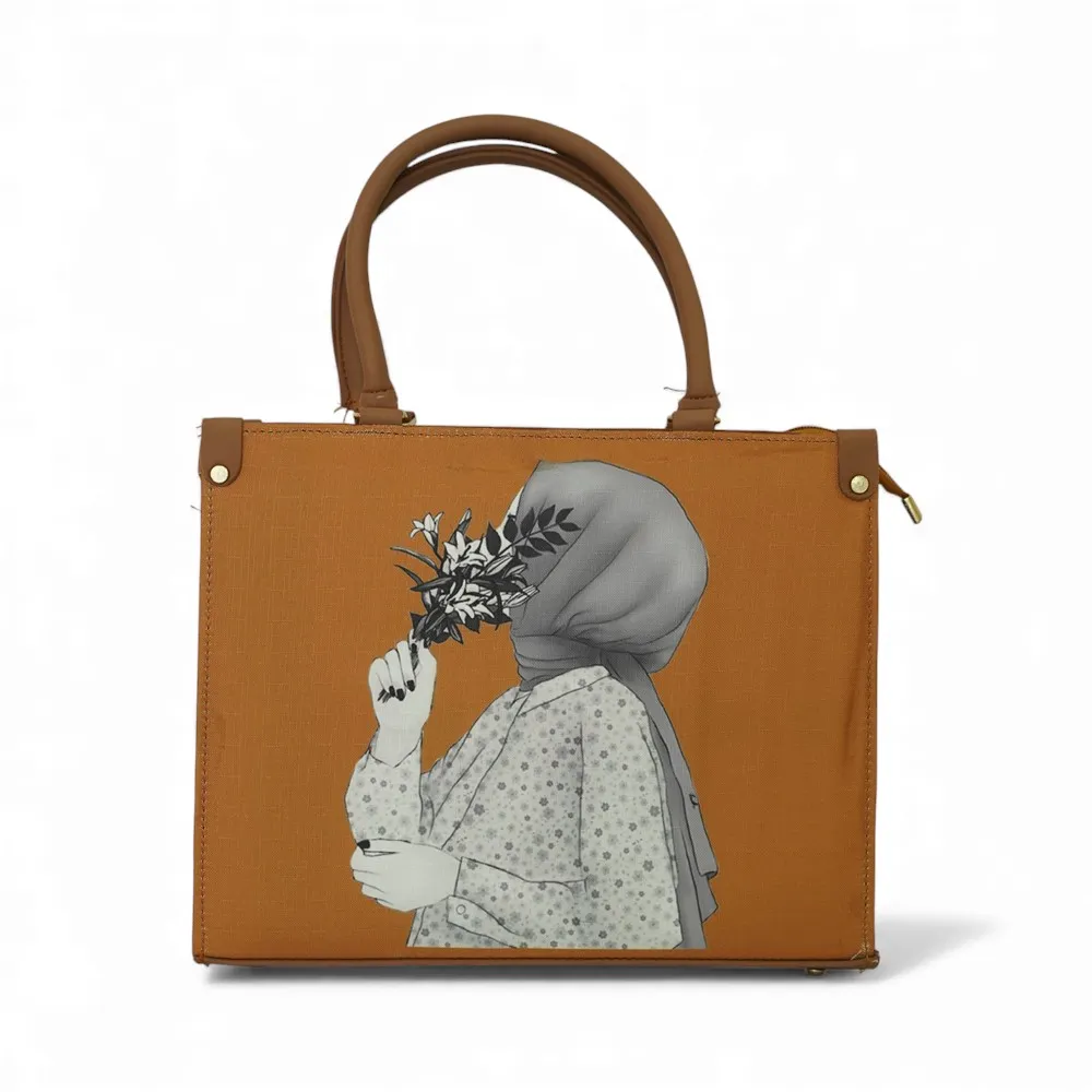 Add a touch of elegance to your look with this beautifully designed printed handbag. Made from high-quality soft material, it features a captivating artistic print of a woman holding flowers — a perfect blend of art and fashion. The golden metal accents and durable handles elevate its premium appeal, making it suitable for both everyday use and special occasions.